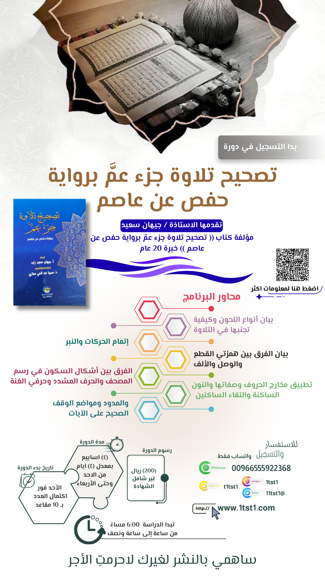 تصحيح تلاوة جزء عمَّ برواية حفص عن عاصم للجزء الثلاثون ثم تصحيح التلاوة من الأجزاء المحفوظة أو الجديدة للطالبات ( حسب رغبة كل طالبة في التصحيح )